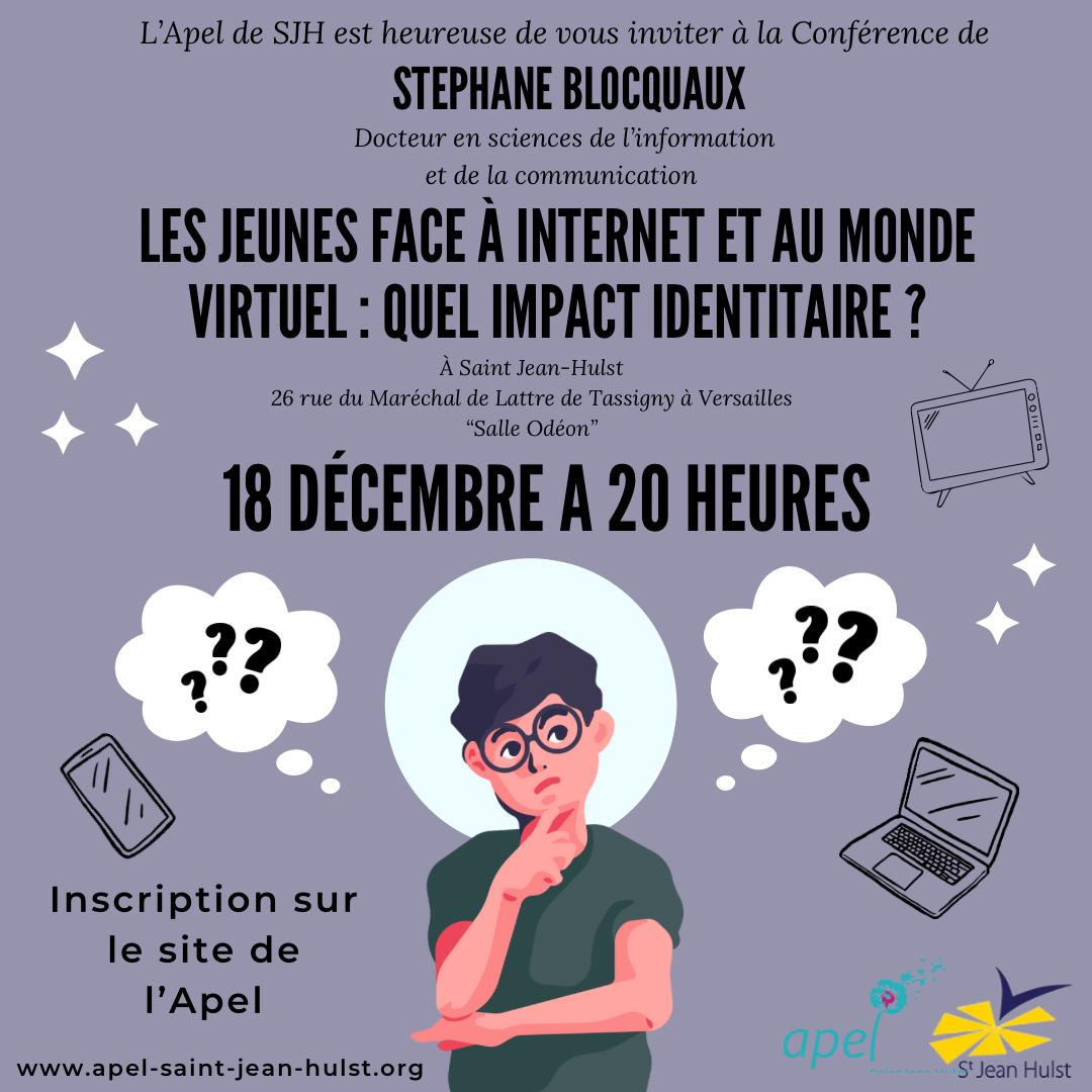 Jeudi 18 décembre, nos élèves de 4ème ont assisté à une conférence donnée par Stéphane Blocquaux sur le thème : « Internet et le monde virtuel : quel impact identitaire ? ».