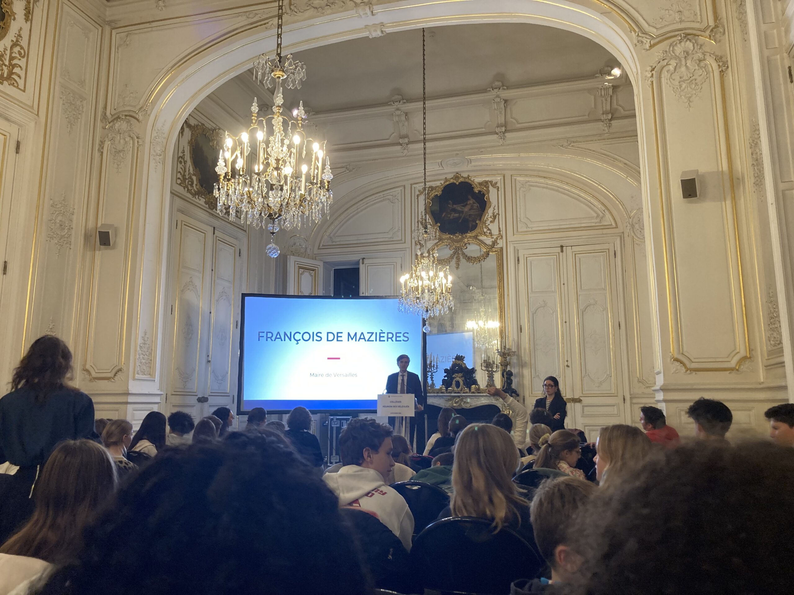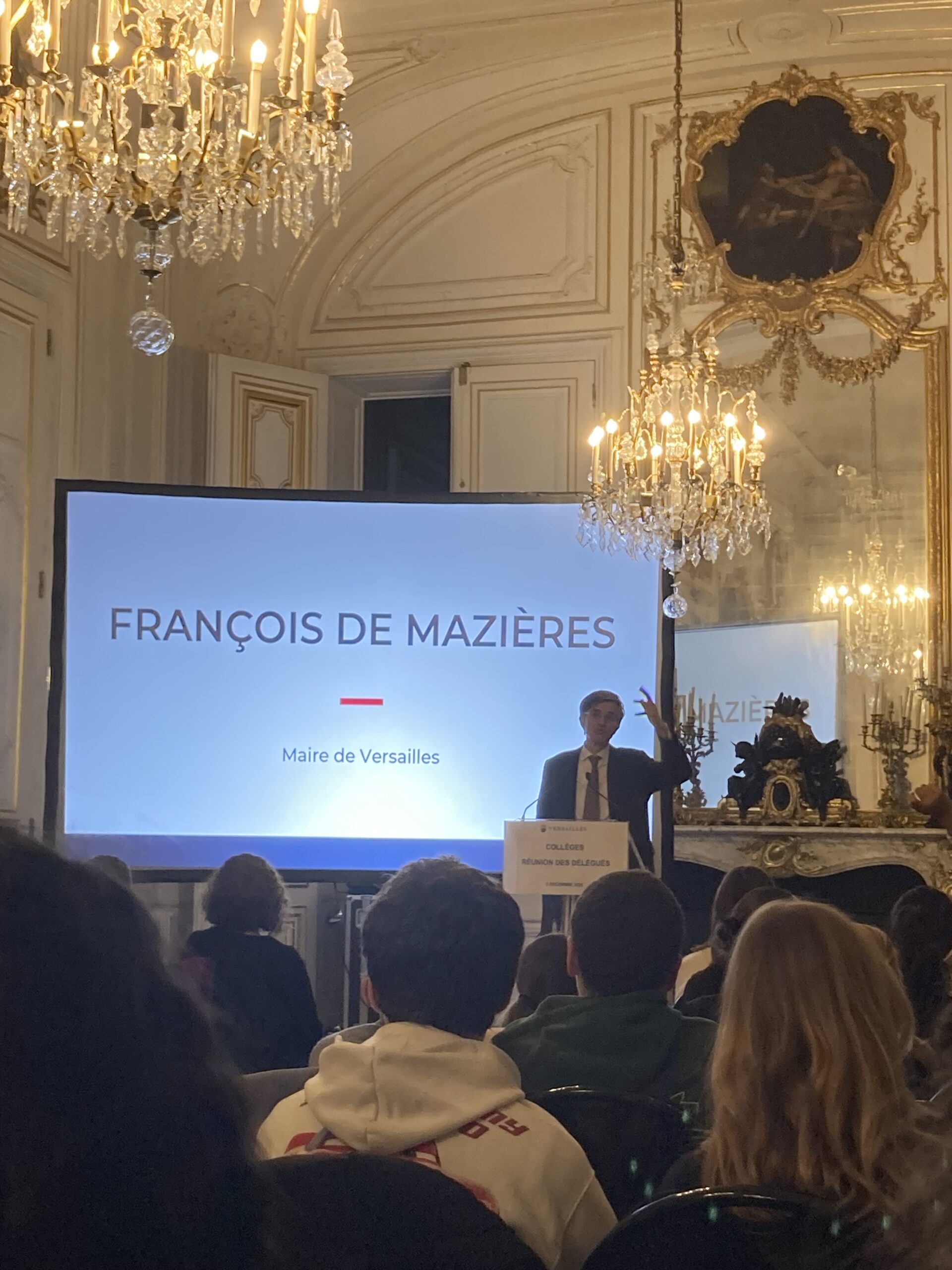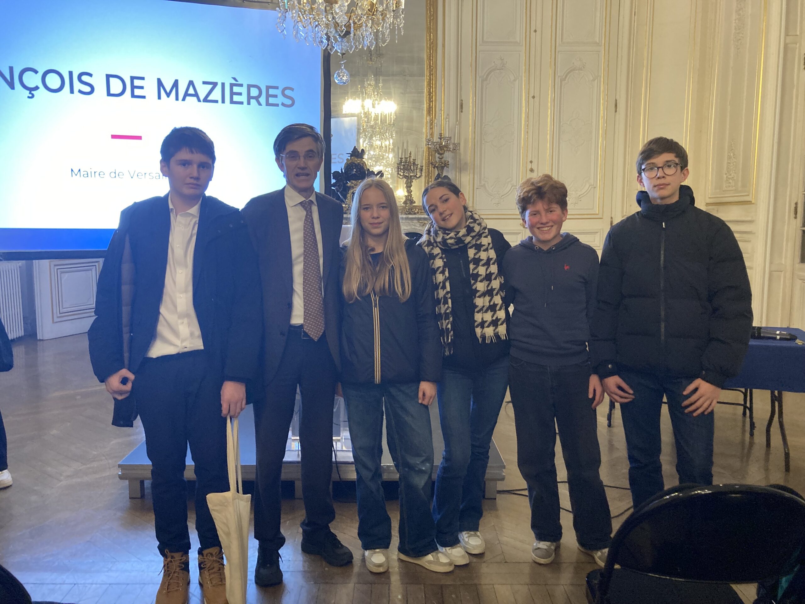 Nos délégués de classe du Collège ont eu l’honneur d’être invités, avec les autres établissements de la ville, à la Mairie de Versailles ce mardi 2 décembre. Dans les Salons de l’Hôtel de Ville, François de Mazières, Maire de Versailles, et Marie-Agnès Amabile, Conseillère municipale déléguée à la jeunesse ont présenté les actions de la Ville en faveur des jeunes, et ont répondu à toutes leurs questions.